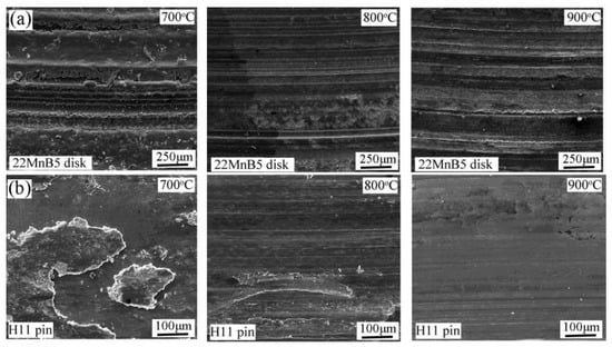 Figure 6 shows the SEM images of the blank and the pin after 200 cycles as a function of the test temperature. It can be seen that the blanks surfaces tested at 800 °C (Sa = 6.25 μm) and 900 °C (Sa = 10.88 μm) have a similar appearance, but are less rough than the one of the disk tested at 700 °C (Sa = 16.33 μm), keeping the same trend described in Figure 4, before the wear tests. Furthermore, the asperities that characterize the heated disk surface are easier to deform at a higher temperature, thus producing a smoother sliding surface. In regards to the surface of the pins, a similar phenomenon can be observed. Massive material adheres to the surface of the pin tested at 700 °C, whereas the surface of the pin tested at 900 °C is very smooth. The more significant surface flattening for both the blank and the pin at the highest heating temperature can also explain the reduction of the friction coefficient at increasing temperature.