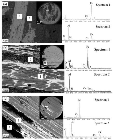 The SEM images of the cross sections of the blanks after the thermal simulation tests at 700 °C, 800 °C, and 900 °C are shown in Figure 3 together with the results of the EDX micro-chemical analysis.