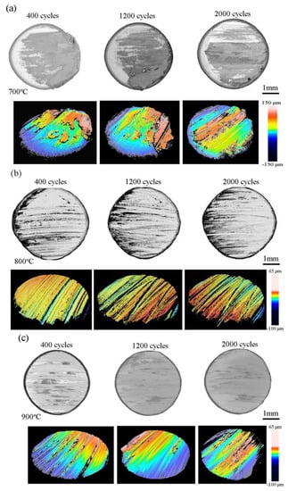 Topography of the pin surfaces at increasing numbers of cycles when testing at (a) 700 °C, (b) 800 °C [24], and (c) 900 °C.