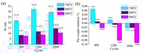 Surface roughness Sa (a) and weight variation (b) of the pins tested at different temperatures and measured after 400, 1200, and 2000 cycles.