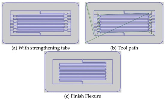 A collection of machine tools available at OMAX, CBA, and other facilities were selected for the project. One of the early tasks was to define a reference part that was suitable to be machined and/or fabricated with all the selected machine tools. A decision was made to use one the flexures investigated at NASA/JPL as a key component of prototype microsplines for asteroid grippers developed under the Asteroid Redirect Mission [,]. As shown in Figure 1, the flexure consists of 11 full-length and 2 half-length spring-like elements. The length and width of the flexure elements were 36.3 mm and 0.5 mm, respectively. The separation between each element was 0.76 mm. The aspect ratio (length/width) was therefore 72.6. The widths of the element and gap between them are 0.51 mm and 0.76 mm, respectively. The aspect ratios of the length-to-width and length-to-thickness were 71.5 and 47.7. The above are the dimensions of the full-scale flexure. Small-scale flexures with 0.5, 0.4, and 0.33 were also machined using several tools. The flexure is extremely delicate and flexible. It took only very weak side force exerted onto the flexure element during machining to deflect them permanently. During the course of machining, strengthening tabs were used to support the delicate elements (Figure 1a). Figure 1b shows the tool path with several color coded curves: green—traverse without cutting, magenta—lead in and out, and blue—cut at quality five level. The tool path shown in Figure 1b included two steps: (1) machine the flexure with the tabs in place and (2) remove the tabs. Figure 1c shows the final part with the tabs removed.