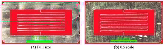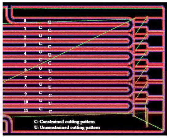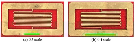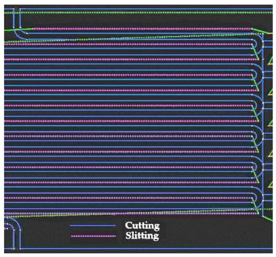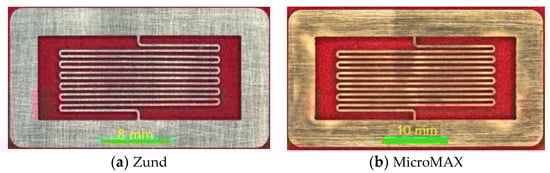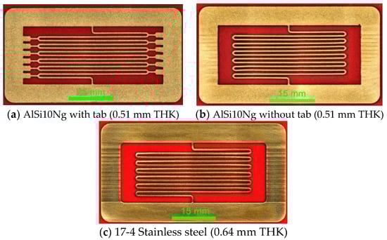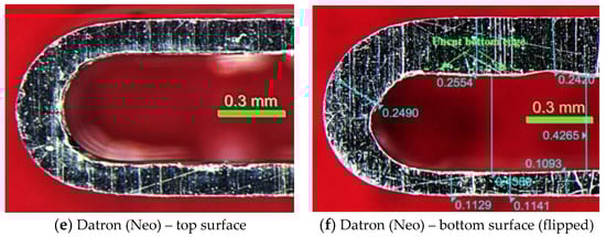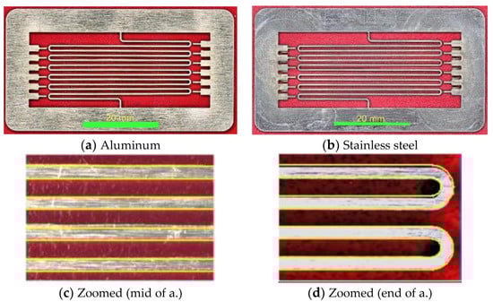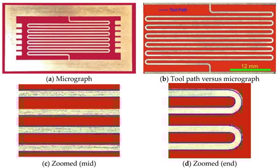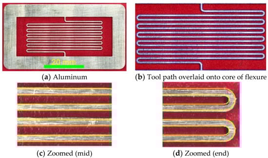 Magnified views of the two small areas in the middle span and the right end loops of Figure 2a, were selected to compare in detail the flexure element and the tool path, as shown in Figure 2c,d. The areas were chosen because they were farthest away from the two anchoring points and least supported. The selection was made to show the worst mismatches in those two segments of the entire element. Yet, the match shown in Figure 2c is excellent. A very slight mismatch is observed in Figure 2d. The maximum mismatch was measured to be about 0.1 mm, part of which is attributed to the error in overlaying of the tool path onto the micrograph. Figure 2c,d show nearly no macro distortion induced by the waterjet cutting process, clearly demonstrating the advantages of cold cutting and low-side-force exertion. In fact, previous investigation verified that waterjet, as opposed to wire EDM, preserved the structural and chemical integrity of parent materials [].