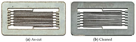 The FabLight laser was used to cut a flexure on a 304 stainless steel sheet (0.61 mm THK). The laser was operated in the 2-pulsed mode. The cut and pierce parameters are listed in Table 1. Figure 8a,b show the back side of the as-cut and cleaned flexures. The cutting speed was too slow so that heat melted materials on the cutting edges of the workpiece. The molten metal flowed downward and re-solidified on the lower surface forming the recast or slag. The side view of the flexure would look just like that on a CO2 laser-cut parts []. One of the remedies was to increase the pulsation frequency from 500 Hz to 5 kHz at the sacrifice of the cutting speed.