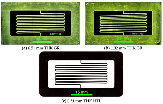 Flexures were printed at BMF Material Technology, Inc. in Shenzhen City, Guangdong Province, China. Flexures were printed using two materials, GR and HTL, that were acrylic based photosensitive resin developed by BMF. Refer to its material properties in Table 3 (https://bmf3d.com/materials/). Two GR flexures (0.51 mm and 1.02 mm THK) are shown in Figure 10a,b. The surfaces of the flexures were quite smooth and flat. Both showed noticeable distortion along the direction of the Y-axis on the X-Y plane. A portion of the element segments were bent slightly as indicated by the nonuniform gap width between several straight sections of the element. The distortion is more severe on the thick flexure than on the thin one. Figure 10c shows a third flexure built from the HTL material in black color. Distortion of the flexure element was also observed.