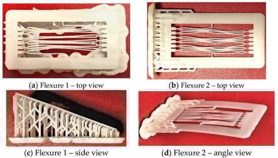 Stereolithography, an additive manufacturing process that polymerizes a liquid resin with light, was used at Formlabs to print two different sets of flexure with different supporting structures []. A Model Form 2 printer, a galvanometer system to steer a laser on a cure plane for this purpose, was used in this case. A model is sliced into layers as thin as 0.025 µm and created layer-by-layer on this cure plane (https://formlabs.com/blog/ultimate-guide-to-stereolithography-sla-3d-printing/). Wherever the laser hits the resin, the material hardens into the final part. An inverse stereolithography process, parts are formed "upside down", and are drawn up from a tank full of rigid resin that was reinforced with glass to offer very high stiffness and polished finish [].