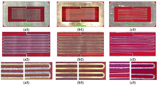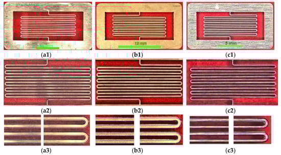 Downsized stainless steel flexures cut with μAWJ nozzlles on MicroMAX: flexure with frames (a1, b1, and c1); tool paths superimposed onto flexure elements (a2, b2, and c2); and tool paths superimposed onto flexure elements—zoomed in (a3, b3, and c3).