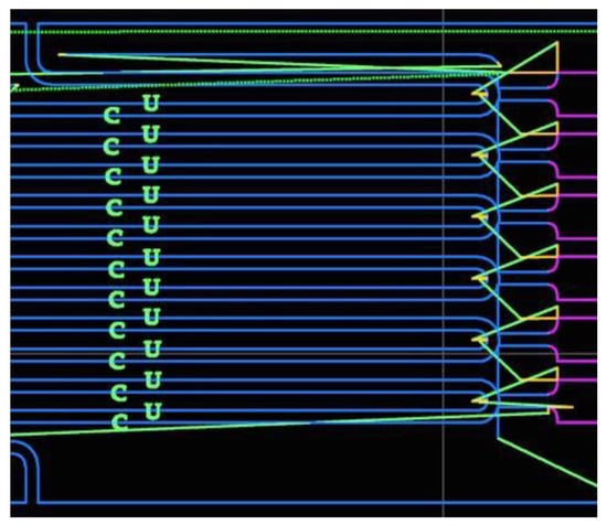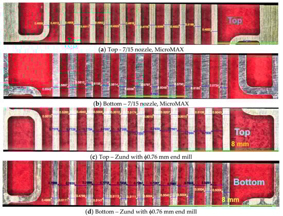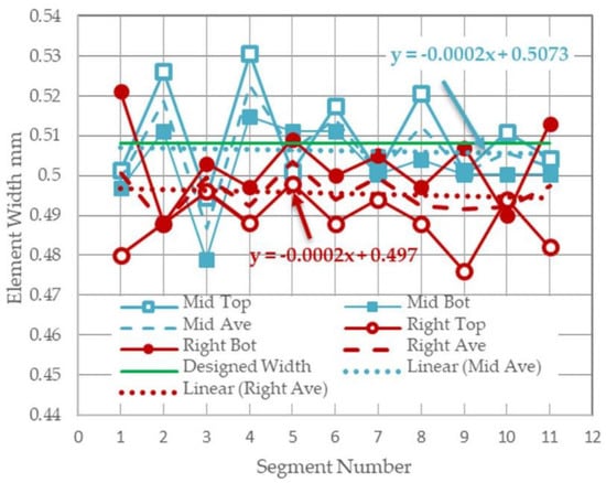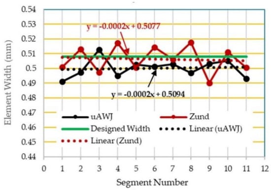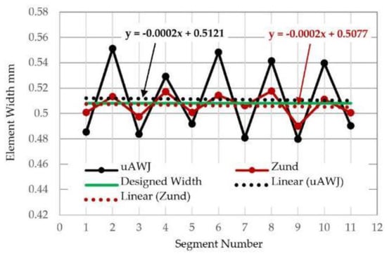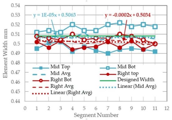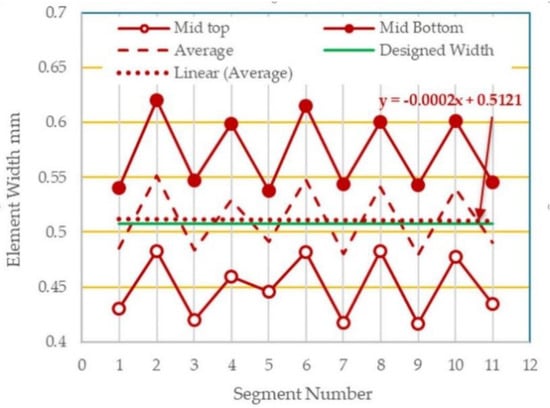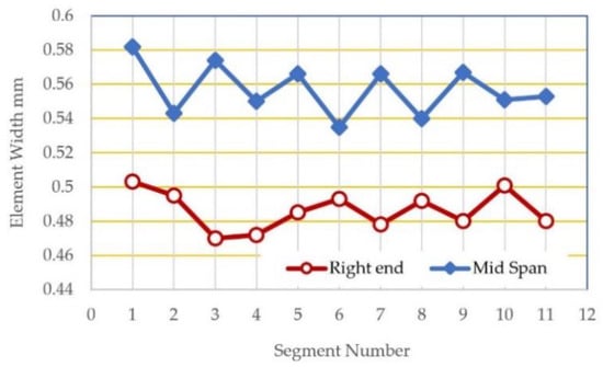 With the increase in the stiffness of the stack together with the support of the honeycomb, the sideway and downward displacements of the flexure element in response to the μAWJ loading also reduced considerably. As a result, the nonuniformity of element width reduced accordingly, as shown in Figure 26. In fact, comparing Figure 26 and Figure 27 shows that the total variation in the element width was less for the μAWJ-cut flexure than the Zund-cut counterpart.