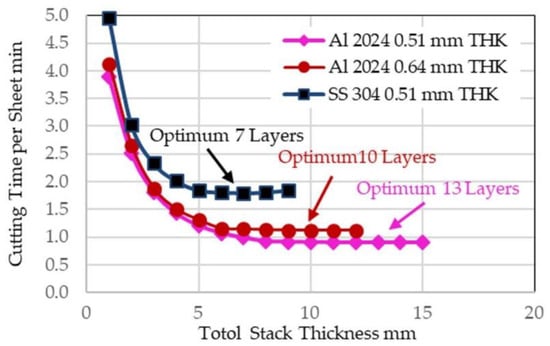 Subsequently, we decided on adopting the AWJ stack cutting process as the final remedy to minimize the nonuniformity of the width of the even and odd flexure elements and the edge taper. The stack was formed by using 3M double-adhesive tapes with a thickness of about 60 μm. A 10 mm thick aramid honeycomb with fiberglass faceplates was used to support the metal stack for further enhancing the stiffness. The cutting model is equipped with a stack calculator to estimate the optimum number of layers based on the cutting parameters. The optimum number of sheets is defined as the total stack height at which the average cutting time per sheet has reached the minimum. Figure 23 illustrates the results of stack calculation for two aluminum (0.51 and 0.64 mm thick) and one stainless steel (0.51 mm thick), respectively. The estimated numbers of layers for the three metals cut at the quality level of five are 13, 10, and 7, respectively. The cutting times for single sheets reduce from 3.90 to 0.90, 4.13 to 1.12, and 4.95 to 1.80 min, respectively. The reductions in the cutting time are 4.4, 3.7, and 2.8 times for the three metals.