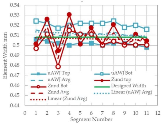 For cutting very thin materials, the cutting speed is too fast for the TAJ to respond with taper compensation. Therefore, the TAJ is usually deactivated resulting in measurable edge taper. Figure 22 shows the measured element width at the mid-span of a 0.51 mm thick stainless-steel flexure under the C-C/U-U cutting mode. In addition to the nonuniform element width of the even and odd flexure segments, the presence of the edge taper resulted in a difference of about 0.1 mm between the element widths measured on the top and bottom surfaces.