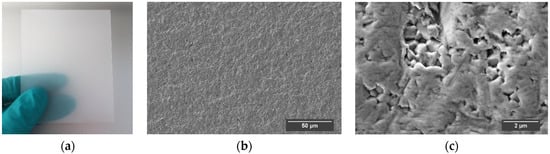 Translucent multi-wire sawn alumina ceramic wafer from the feasibility study: (a) dimensions: 80 mm × 65 mm × 0.5 mm; Ra = 0.3 µm; (b,c) FESEM images of the as cut wafer surface.