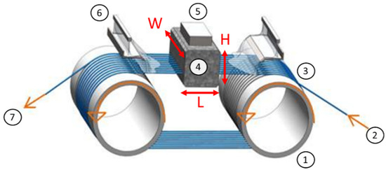 1: Wire guide rollers; 2: Fresh wire; 3: Wire web; 4: Workpiece; 5: Top plate; 6: Slurry nozzles; 7: Used wire (H—height; L—length, W—width of the workpiece) [10].