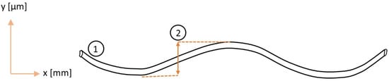 For all sawing processes, a standard wire (structured steel wire; coating: copper, zinc; nominal diameter: 115 µm) for multi-wire slurry sawing was used. The thickness of the wire needs to be adapted to the groove width of the wire guide rollers and the size of the abrasive particles used to avoid wire breakage. The periodical curvatures in 2 dimensions increase the effective wire diameter (Figure 5). The periodical curvatures of the wire allow for a larger amount of slurry to be transported into the sawing channel compared to a conventional straight steel wire [11]. This enables sawing at higher feed rates. In the sawing process, the wire bow elongates the structured wire and thus increases the wire tension locally under the workpiece. The result is a loss of wire tension due to plastic deformation when the wire leaves the workpiece [12].