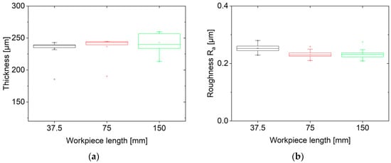(a) Thickness variation for different workpiece lengths, (b) roughness values for different workpiece lengths.