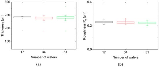 Figure 9a shows no significant increase in the thickness variation of the wafers with the growing number of wafers. The roughness measurements are all in the range of Ra = 0.20 to 0.25 µm (Figure 9b).