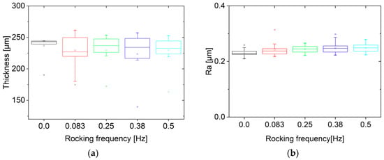 (a) Thickness variation for different rocking frequencies; (b) roughness values for different rocking frequencies.