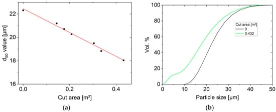 Part of the sawing process monitoring includes the grain size analysis of the abrasive particles. All grain size measurements from the experiment I–III are listed in Figure 12a. A negative linear relationship between the boron-carbide grain size and the cut area during multi-wire sawing in the range of 0–0.43 m2 is found. The heavy wear of the boron-carbide grains is caused by splintering due to the mechanical stresses in the sawing channel. The d50 value after a cut area of 0.43 m2 has decreased from 22.3 to 18.0 µm. The slope of the linear fit shows a wear rate of the d50 value of −10.2 (±0.5) µm per sawn m2. The d50 value is halved after a cut surface of approx. 1.1 m2. However, it has to be tested if the observed linear relationship holds also for lower d50 values. The d10 value shifts from 14.9–3.7 µm when 0.43 m2 are cut (Figure 12b). An increased fine-grain fraction, as well as the smaller grain size, have a detrimental effect on the cutting ability and lowering the material removal rate during multi-wire sawing [13].