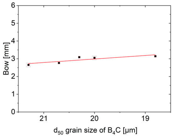 Effect of abrasive particle wear on the size of the bow (; COD (r2): 0.72). The d50 grain sizes of the grey marked data points are not measured experimentally.