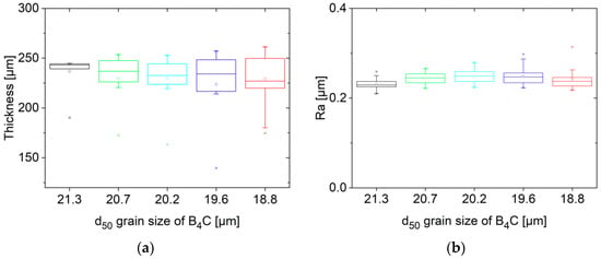 In Figure 13, an increase of the size of the bow of 0.2 (±0.1) mm per µm d50 value of the abrasive particles in the range of 22.3–18.8 µm can be detected. The wear reduces the number of large grains involved in the removal process (Figure 12b), which lowers the material removal rate. No samples for grain size measurements could be taken after the sawing experiments with a rocking frequency of 0 and 0.38 Hz. Thus the d50 grain sizes of 21.3 and 20.0 µm at a cut area of 0.11 and 0.24 m2 are extrapolated from the observed linear wear rate of the boron-carbide grains (Figure 12a). An increase in the variation of the wafer thickness was observed with a decreasing d50 value of the abrasive grain size. The roughness measurements do not show this trend but are in the range of Ra = 0.2 to 0.3 µm (Figure 14a,b). The heavy wear of the abrasive grains must be taken into account to avoid wire rupture when cutting large blocks.
