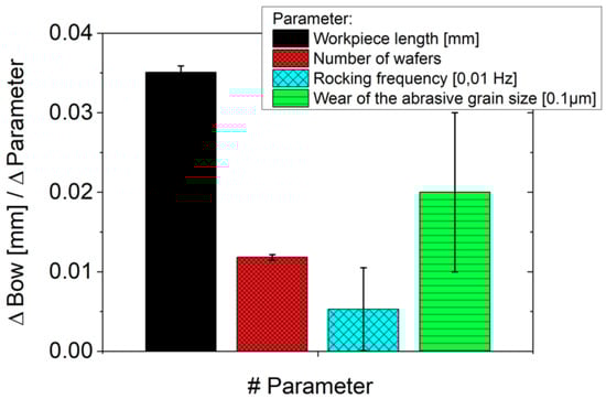 Due to the mechanical properties of the used translucent alumina ceramic, the workpiece can only be cut with a feed rate of the table of 20 µm/min. The formation of the bow of the wire web leads to a cutting speed of −17 µm/min under the experimental conditions. When multi-wire sawing of silicon, feed rates > 700 µm/min are possible [8]. Under the process conditions investigated in this study, no measurable wire bow would occur when cutting silicon. Figure 15 summarizes the main results of the study on the size of the bow during multi-wire sawing of the used alumina ceramic. The slopes of the linear regressions of the analyzed variations (workpiece length, number of wafers, rocking frequency, wear of the abrasive grain size) with their standard-errors as error bars are displayed in this bar chart. The influence of the workpiece length and the number of wafers on the size of the bow is much greater than the scatter in the experiments. Thus, these parameters have to be accounted for when choosing the cutting parameters. The influence of the rocking frequency on the size of the bow compared to the experiment scatter is small, hence no or only a very small influence is to be expected. Despite the strong scatter of abrasive wear, a clear dependence on the cutting ability was demonstrated.