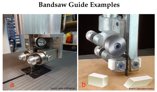 The bandsaw blade is tensioned using either mechanical or hydraulic systems to provide the required stiffness to the blade for cutting. The main purpose of the bandsaw guides (on two sides of the workpiece) is to keep the alignment of the blade in check and to provide additional stiffness to the blade near the cutting region [5]. Furthermore, guides help to reduce lateral vibration of the bandsaw, especially while cutting at higher feed rates [6]. In most cases, the bandsaws either use a carbide or ceramic block or sealed bearings as blade guides (see Figure 1). The disadvantage of block guides is the considerable sliding (Coulomb) friction between the blade and the guides. The guide material must therefore have a low coefficient of friction with the blade material, and high wear resistance and heat resistance. In the case of the roller or bearing guides, the sliding friction is replaced by much smaller contact rolling friction. However, high-precision installation of the roller guides is required, and one-sided loading of the bearings turning at high speeds is a cause of lifespan reduction. Furthermore, as the blade deflects and bends against the rollers, very high stresses are generated that further reduce the durability of the blades [7].