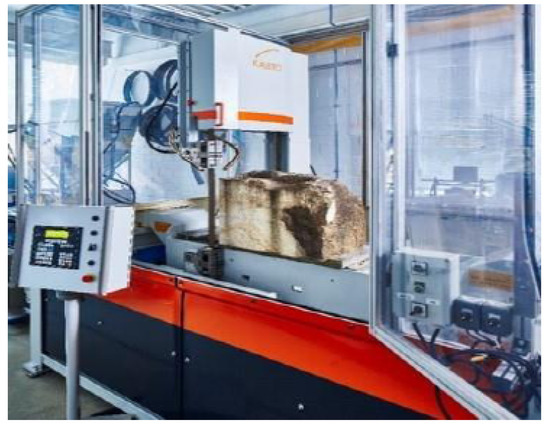 A modified version of the KASTOplate U3 bandsaw machine consisting of a 700 mm carrier frame increase and a compensating guide arm with a wheel diameter of 700 mm to allow for larger stone-cutting experiments was used for the cutting tests (see Figure 2). The maximum achievable cutting speed on the machine was 150 m/min, feed rate 250 mm/min. The workpiece was a 500 mm × 400 mm × 400 mm [lxwxh] block of white Carrara marble. The bandsaw blade used was a galvanically coated diamond blade with a width of 67 mm, with a thickness of 1.6 mm and a constant pitch of 30 mm.