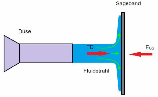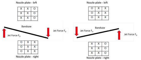 The principle of the hydrostatic blade guide is shown in Figure 3. The force exerted on a wall by a water jet according to Sigloch [15] is given in Equation (1). Where is the reaction of the exerted force on the wall, the density of the fluid (in this case, water), the volume flow rate per nozzle, the speed of the jet coming out of the nozzle, and is the cross-section area of the nozzle. In the system shown in Figure 3, for the jet force to balance the passive force in the bandsaw blade while cutting, the reaction force should equal the sum jet force .