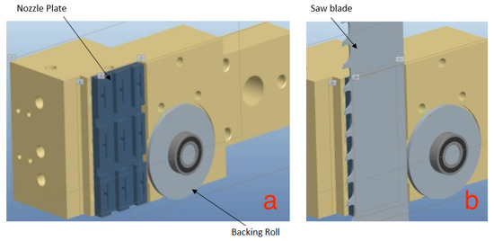 CAD design of the hydrostatic blade guide system showing the nozzle plate, backing roll, and the holding block. (a) Without the bandsaw blade; (b) with the bandsaw blade.