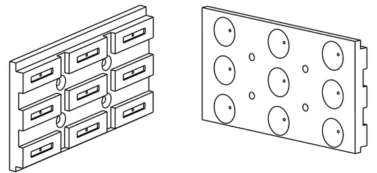 The hydrostatic band guides were designed in the form of nozzle plates having nine holes or nozzles. The plates were made of stainless steel X5CNi18-10. The design of the guide system is shown in Figure 5. The water pump attached to the machine, from the French manufacturer Wilo, was a centrifugal pump with a maximum volume flow rate of 14 m/h and a maximum achievable pressure of 8 bars. The final design parameter, or the diameter of the individual nozzles, was calculated based on the maximum force, volume flow rate of the pump, and the number of nozzles, as shown in Equations (2)–(5).