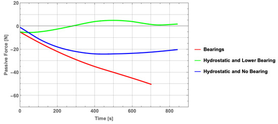 Average passive force progression from five repetitions with: (red) sealed bearings as both upper and lower guides; (blue) hydrostatic upper guide and bearing lower guide; (green) hydrostatic upper guide and no lower guide.