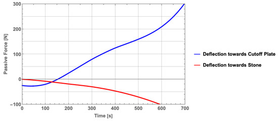 Average passive force for (blue) band deflection towards the plate being cut (red) band deflection towards the remaining block of stone.