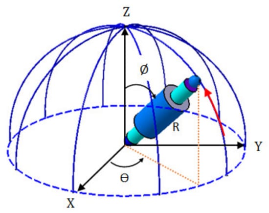 which presents the first partial derivatives of the ball-bar length variations to the machine error coefficients and the setup errors. Ji is the Jacobian for each position (3 × 1). The θ and ϕ are the polar and the azimuthal angle, respectively, illustrated in Figure 2. So, the error of the tool tip projected in the ball-bar direction, ρ, is related to the error coefficients as,