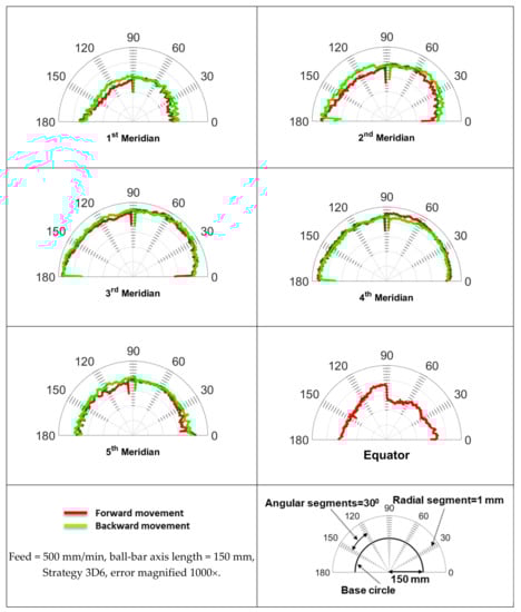The experimental ball-bar measurements for the strategy 3D6 are shown in Figure 4 for the movements along the meridians. Each polar plot contains the measurement data of the forward and the backward movements. The errors are magnified 1000 times. Each segment is equal to 1 µm.
