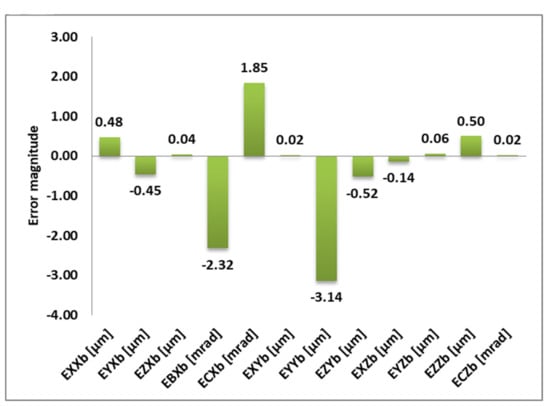 The maximum discrepancy between the predicted and the measured projected Cartesian volumetric errors is less than 2 µm. The maximum backlash happens for the Y-axis, EYYb, which is around −3 µm. However, the minimum backlash is for X-axis, EXXb, which a magnitude of 0.5 µm. The target machine tool does not reveal a big lateral play since the maximum lateral play is for the error coefficient EYXb with a magnitude of −0.4 µm. The backlashes and the lateral plays values are shown in Figure 6.