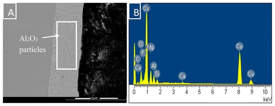 Table 1 shows the composition of the materials studied. Prior to bonding, the Ti–6Al–4V sample was coated with an electrodeposited copper coating (Cu) containing α-Al2O3 nanoparticles having an average diameter of 40 nm. The electrodeposition process was carried out as described in a previously published article []. A scanning electron microscopy (SEM) micrograph and energy-dispersive spectroscope (EDS) spectrum of the interlayer confirmed the uniform distribution of nanoparticles within the coating (see Figure 1). The bonds produced using a 5 µm thick Cu/Al2O3 interlayer were compared to bonds formed using 25 µm thick Cu foil to assess the role of the particles in the bonding process and the properties of the joint interface.