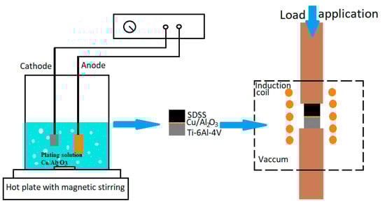 Samples of 10 mm diameter and 7 mm length were prepared from bars of Ti–6Al–4V and duplex stainless steel. The Ti sample was coated for 10 min to deposit the Cu/Al2O3 coating. A schematic of the process is presented in Figure 2. The coating process was published in a previous article []. A hole of 1.5 mm diameter by 3 mm deep was drilled into the Ti sample to accommodate a K-type thermocouple. The faying surfaces were prepared by grinding progressively from 320 to 2500 grit size SiC, polished to 1 µm grit size using particle-impregnated carrier paste, and then cleaned in an acetone bath.