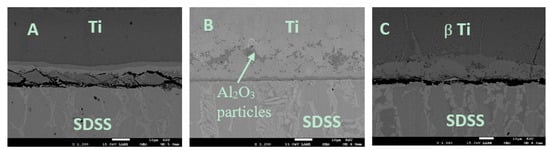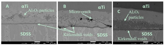 The EDS line scans presented in Figure 9 show that a large portion of the reaction layer formed on the Ti side of the bond was promoted by the diffusion of Cu into the Ti base metal, given that Cu diffuses faster into Ti than it does into SDSS. Similar findings were observed when the Cu/Al2O3 interlayer was used (see Figure 9). The reaction layer was found to have a higher percentage of Cr and Fe, which may suggest that Fe and Cr diffused faster into the Cu/Al2O3 coating than into the Cu foil.