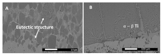 SEM micrographs of (A) the eutectic structure form at the interface for samples bonded at 900 °C; (B) Microstructure on the Ti side of the interface.