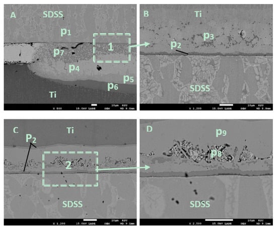 The influence of the interlayer composition on the microstructure of the joint region was investigated by comparing bonds formed using an electrodeposited Cu coating containing α-Al2O3 nanoparticles (Figure 6A,B) and a 25 µm Cu foil was used as the interlayer (Figure 6C,D). Figure 6A shows the presence of six separate distinct layers, where each layer is distinguishable by the shade of the specific region. These areas were labelled P2–P7. The elemental composition of each phase was identified using EDS and is presented in Table 2. The EDS analysis shows that the composition of P1 is that of the super-duplex stainless steel because of the high Fe and Cr content and low Cu concentration.