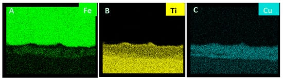 EDS maps of Ti–6Al–4V and SDSS joint bonded at 850 °C for 45 min with 25 µm Cu foil. EDS mapping of elements (A) iron, (B) Titanium, and (C) Copper.