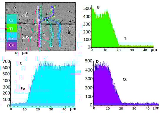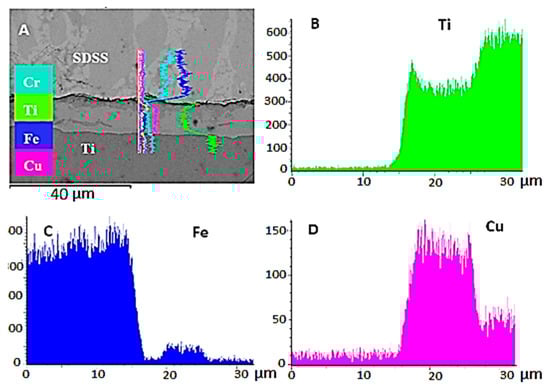 (A) SEM micrograph of a region on the Ti–6Al–4V and SDSS joint bonded at 850 °C for 45 min with Cu/Al2O3 coating. EDS line scanning analysis of elements (B) Ti, (C) Fe, and (D) Cu.