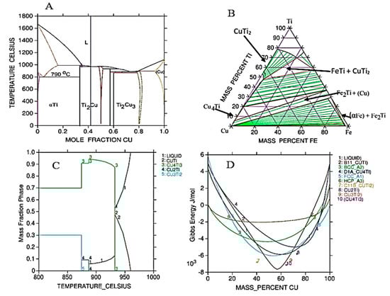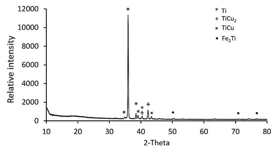 These phases are believed to have formed due to the dissolution of approximately 38 wt % of Cu in the cubic Ti–Fe lattice. The Ti–Cu–Fe ternary phase diagram presented in Figure 10B confirms the likelihood of the formation of intermetallic compounds within the temperature range of 800–900 °C [].