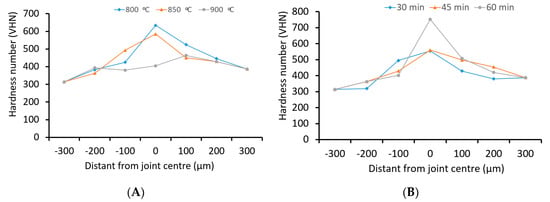 (A) Hardness measurements for the sample bonded for 30 min as a function of bonding temperature; (B) Hardness measurements for the sample bonded at 850 °C as a function of bonding time.