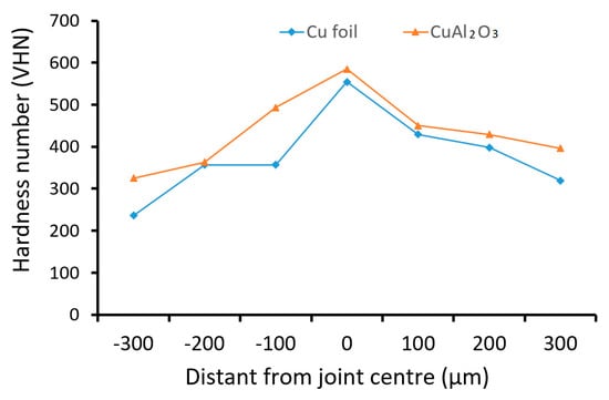 Finally, the impact of interlayer composition on variation of the hardness measurements (see Figure 13) across the joint region was evaluated by comparing the bonds made with Cu/Al2O3 and Cu foil interlayers. The results show that when the Cu/Al2O3 interlayer was used, higher hardness values were recorded in the joint region when compared to samples bonded using Cu foil. The results show that the hardness within the joint center was marginally higher when Cu/Al2O3 coating was used as the interlayer due to the dispersion of hard nanoparticles at the interface.