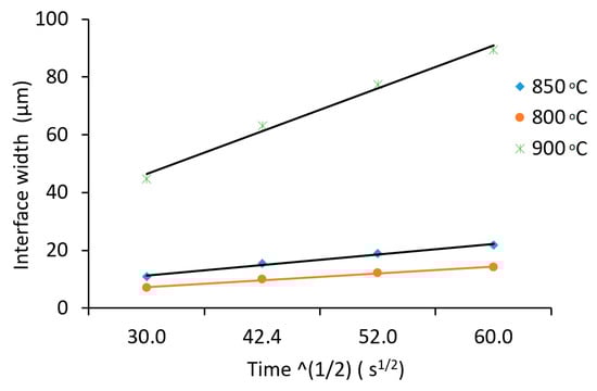 The width of the reaction layer was measured as a function of bonding time and bonding temperature and plotted as shown in Figure 14. The data indicate that as the bonding time increased, the width of the reaction layer also increased as predicted by the power law shown in Equation (1). Similar behavior was observed when the bonding temperature was increased from 800 to 900 °C. This response is believed to be consistent with the changes in the rate constant as the bonding temperature increased. The width of the reaction layer increased with increasing bonding temperature and can be estimated by the mathematical relationship shown in Equation (1):