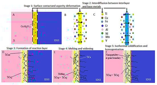 A schematic of the mechanism involved in bond formation of Ti–6Al–4V and super-duplex stainless steel using a Cu/Al2O3 interlayer: (A) Initial surface contact and asperity deformation; (B,C) Interdiffusion between interlayers and base metals; (D) Formation of the reaction layers; (E) Eutectic melting which occurs in samples bonded at 900 °C; (F) Isothermal solidification and homogenization of the interface.