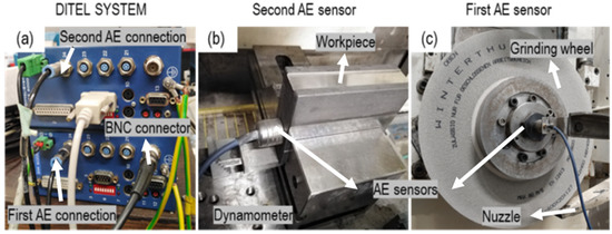 To accomplish the experiments and collecting the Acoustic Emission (AE) signals, 2 desired AE sensors were integrated into a high-performance surface grinding machine Micro-Cut AC8 CNC (Elb-Schliff Werkzeugmaschinen GmbH, Aschaffenburg, Germany). Figure 1 shows the experimental setup. Two AE sensors from DITTEL (Dittel Messtechnik GmbH, Landsberg am Lech, Germany) was used and the amplifier was likewise from DITTEL company. An AE sensor was attached to the workpiece (Figure 1b). The center of the AE sensor was placed 4 mm far from the top and 10 mm from the side of the workpiece. Row AE-signals were recorded from this sensor and subjected to filtering and denoising. To have better view and comparable results between AE sensors during grinding, a second AE sensor for monitoring the grinding process was installed close to the center of the grinding wheel (Figure 1c). This sensor was directly connected to the DITTEL software and the RMS was extracted. The grinding tests were conducted at different cutting speeds (vc), feed rates (vw), and depth of cuts (ae). Table 1 lists the grinding parameters.