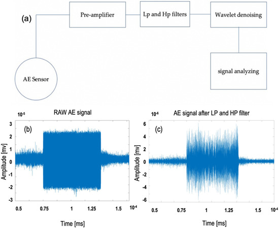 (a) The procedure through acoustic emission (AE) filtering, (b) Raw acoustic signal; (c) AE signal after low pass (LP) and high pass (HP) filtering.