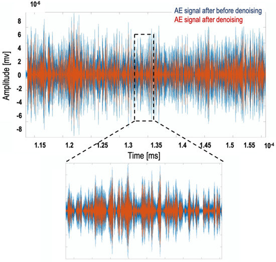 The main characteristic of wavelet analysis is to extract information from the original signal by decomposing it into a group of approaches (lower frequency) and details (higher frequency), distributed over different frequency bandwidths. In this analysis, the discrete wavelet transformation (DWT) algorithm of MATLABs wavelet toolbox was used to decompose the signal into six levels. The DWT distributes the original AE signal into lower and higher frequency bands. The lower frequency band serves as an input signal for the next decomposition level; the information of the higher frequency signal is coded into a detail coefficient of the signal. These coefficients represent the degree of similarity between wavelet function and signal pattern. The total energy of the respected signal is preserved in this transformation. Therefore, band energy can be computed by integrating the square of the decomposed signal corresponding to a particular frequency band with respect to the time [22]. Different values for wavelet denoising parameters were considered. Among all the applied parameters for denoising the AE signals, the parameters which gave the best results for denoising the AE signals and fitted all the AE signals were applied in the wavelet toolbox. The following setting has been applied to the wavelet denoising toolbox in MATLAB are. The wavelet type was set to db and number 4. The level was set to 6 with a soft universal threshold. In the universal threshold let assume that at a certain level of wavelet decomposition, the number of wavelet coefficient is x. Then the universal threshold would be: ). After decomposing the signal and omitting the noises, the signal was reconstructed. Figure 3 shows the AE signals before and after denoising using the mentioned method.