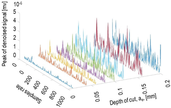 By taking into consideration that the AE signals typically have a big size (consisting of a massive amount of data), it is crucial for monitoring and building the NN to reduce the size of the data. Finding peaks of the AE signals is an approach that can reduce the size of the AE signals for the further computational process, also keeping the main information of the signals that are required for the process. To have a better view of how AE signals vary with the depth of cut, the filtered AE signal versus different depth of cut at the feed rate of 1000 mm/min, and the cutting speed of 20 m/s was plotted (Figure 4). Increasing the depth of cut from 10 μm to 200 μm increased the AE-amplitude significantly.