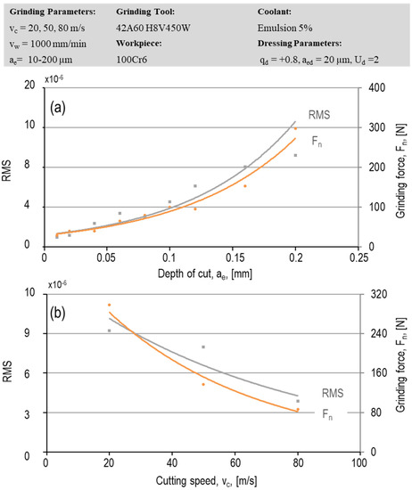 Correlation between the AE signals and normal grinding forces (a) versus depth of cut at the cutting speed of 20 m/s, (b) versus cutting speed at the depth of cut of 200 µm.